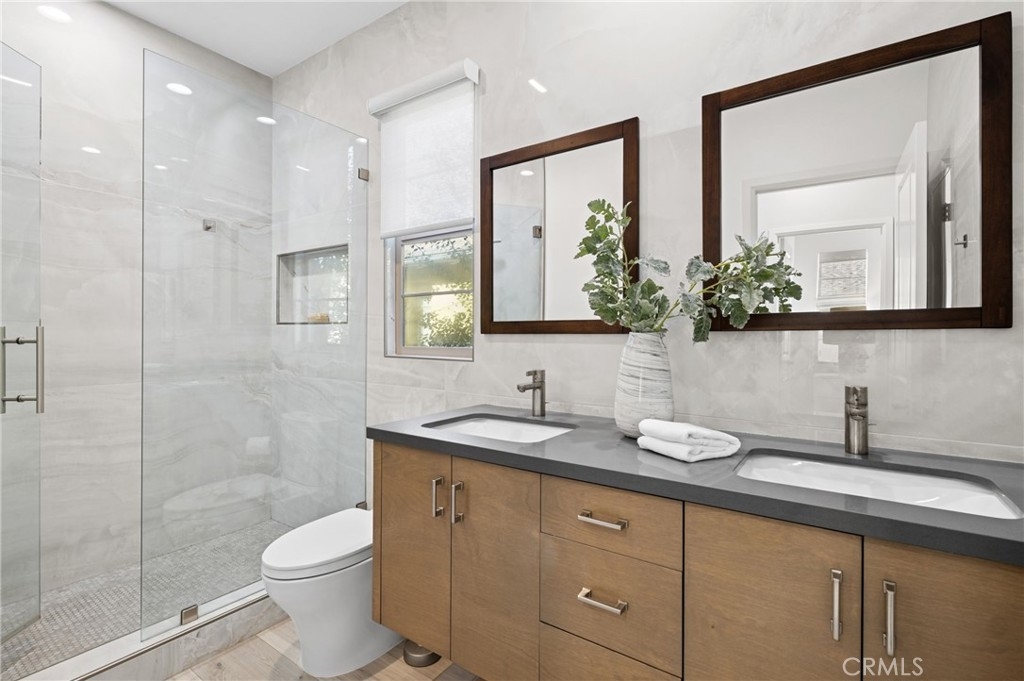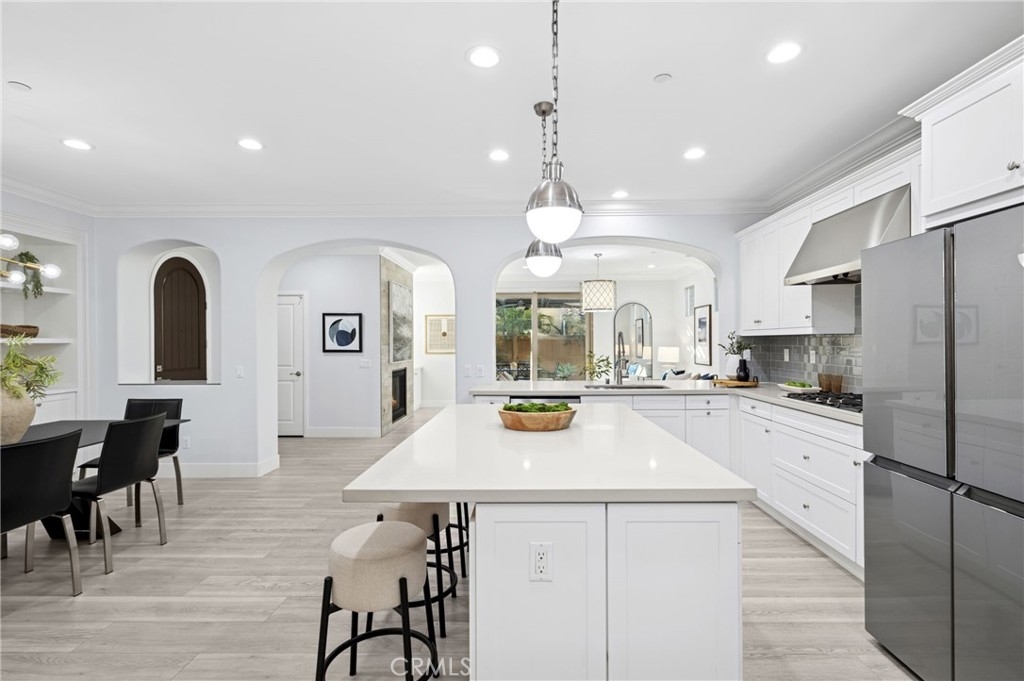 Located in the gated community of San Juan Hills Campanilla, this extensively upgraded detached home supplies an open-concept floor plan featuring 3 bedrooms, 2.5 baths, and a spacious loft with a built-in desk - ideal as a home office or easily convertible to a 4th bedroom. The gourmet kitchen highlights white custom cabinetry, quartz countertops, glass subway backsplash, stainless steel appliances, Café refrigerator, center island, and dual breakfast bars. The living room offers custom built-ins, a redesigned fireplace, and dual sliders creating a seamless indoor/outdoor flow. Upstairs, the primary suite showcases a walk-in California Custom Closet and a spa-inspired bath with a dual-sink vanity, separate soaking tub, and glass-enclosed shower. Two additional bedrooms share a beautifully upgraded guest bath featuring porcelain and quartz tile, an extended shower, Hansgrohe fixtures, and Toto toilets. The versatile loft serves perfectly as a playroom, media room, gym, or office. Additional enhancements include new luxury flooring and baseboards, upgraded fixtures and lighting, ceiling fans, Nest thermostat, hardwired alarm system, interior paint, custom window coverings, solar panels, and a finished garage with epoxy floors and built-in cabinetry. The private backyard is designed for entertaining with custom hardscape, lush landscaping, patio cover, and a putting green. Community amenities include a playground, beach volleyball court, sports court, and picnic area. Low HOA, low tax base, and no Mello-Roos. Conveniently located minutes from downtown San Juan Capistrano, Dana Point, and local beaches.