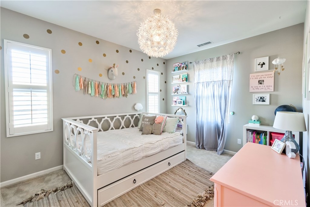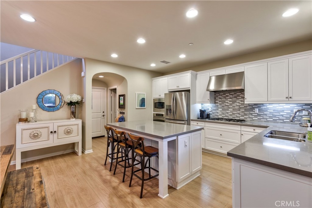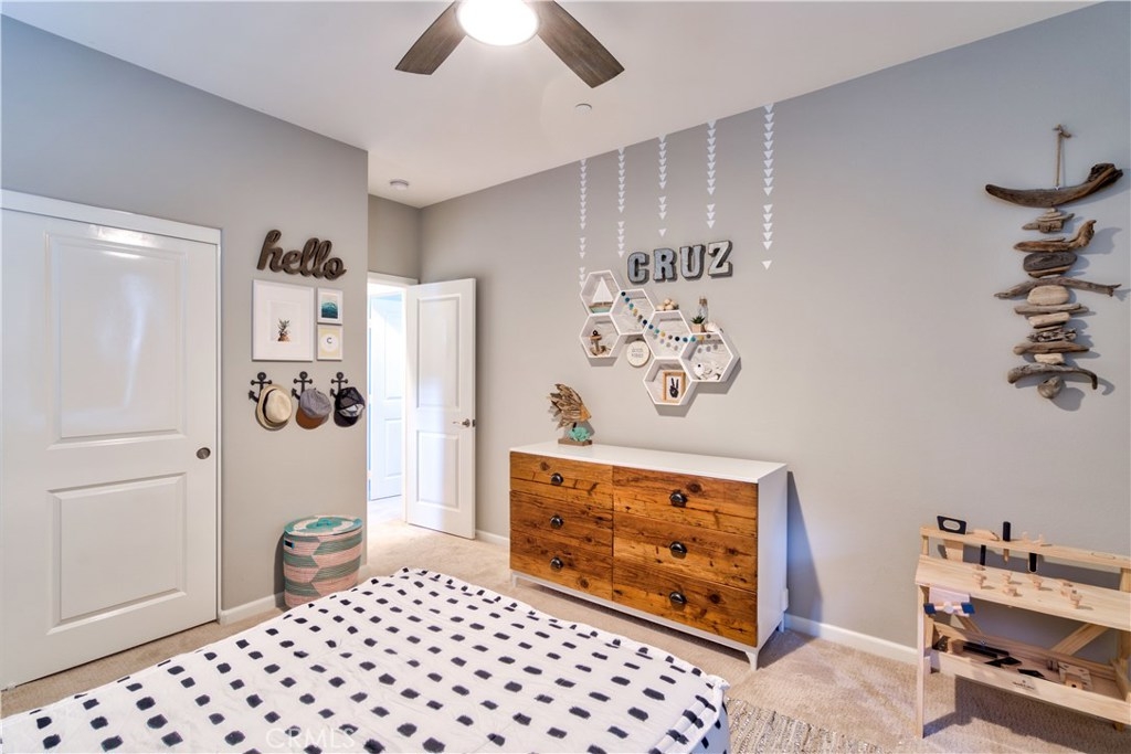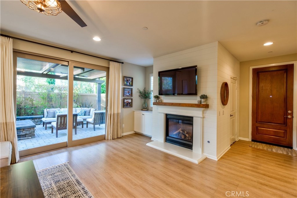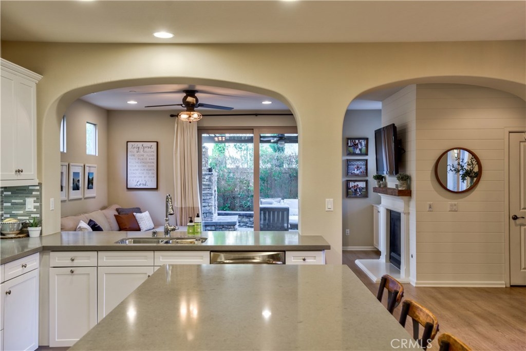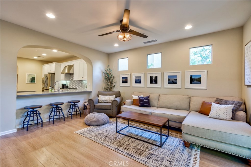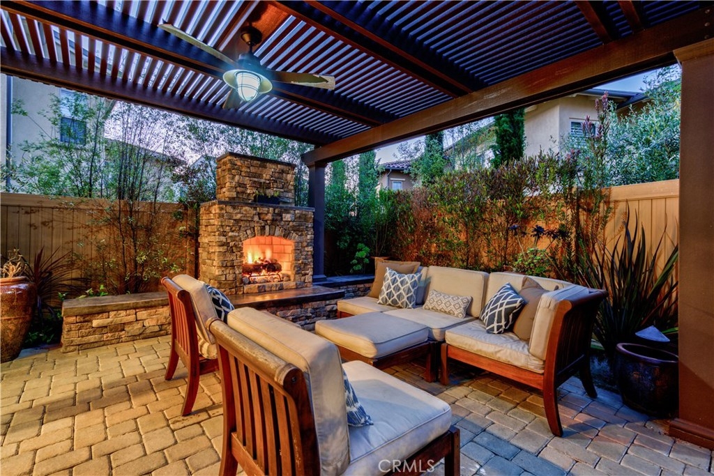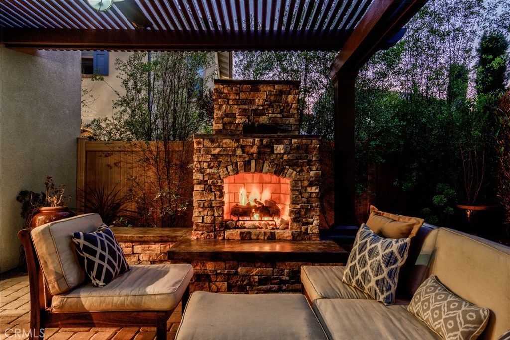 Welcome to this highly upgraded 4 bedroom, 3 bathroom home located in the gated community of Campanilla. It sits on a single loaded, corner lot that is very private. Custom pavers and olive trees greet you as you walk up to the front door. Open concept living at its best as you enter this gorgeous home! The gourmet kitchen is an entertainer’s delight with quartz countertops, stainless steel appliances and a designer back splash. In the center, a huge kitchen island with additional seating for your guests. There is a generous downstairs living space with 2 sets of oversized sliding doors from the kitchen and living room that lead out to the yard. Upstairs, the master suite offers a large walk-in closet, mountain views and a builder upgraded 5 piece bathroom. The loft was converted into a beautiful bedroom with custom windows, a large sliding barn door, wall accents and recessed lights. Upstairs laundry and mountain views from the two additional upstairs bedrooms. The outdoor living space boasts a custom stone fireplace, patio cover, ceiling fan and outdoor TV. The built in BBQ with fridge and seating for 8 will keep you entertained all year. Southern California living at its best! Low HOA and NO Mello Roos!!