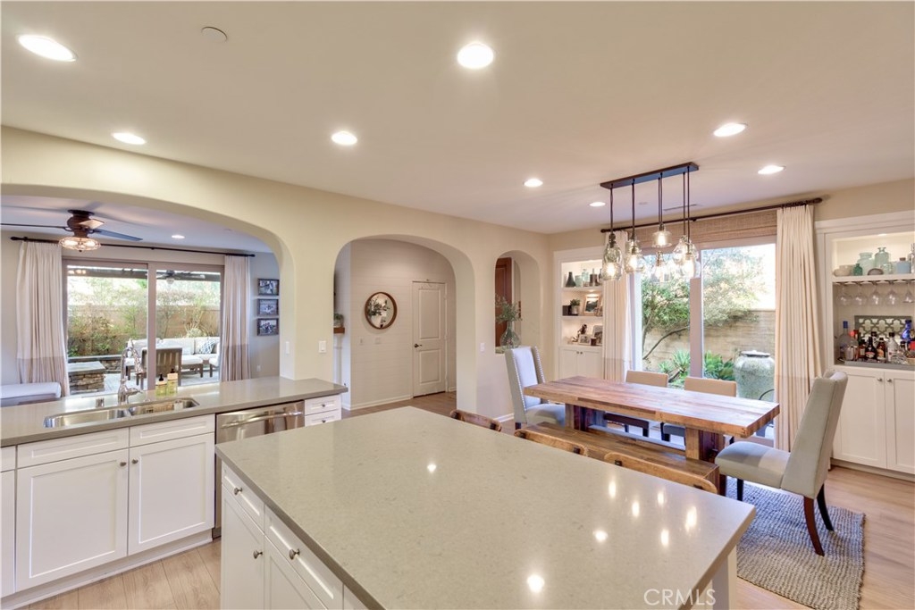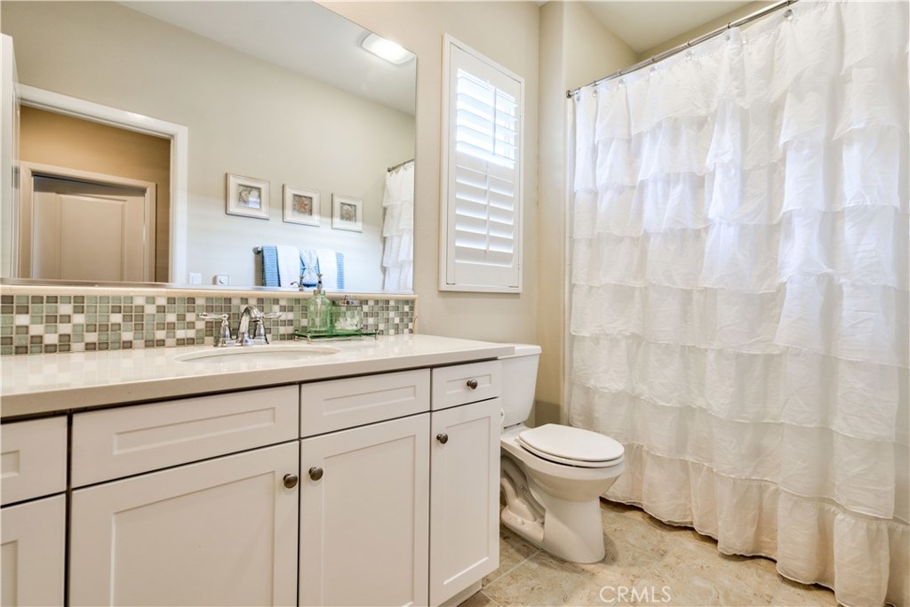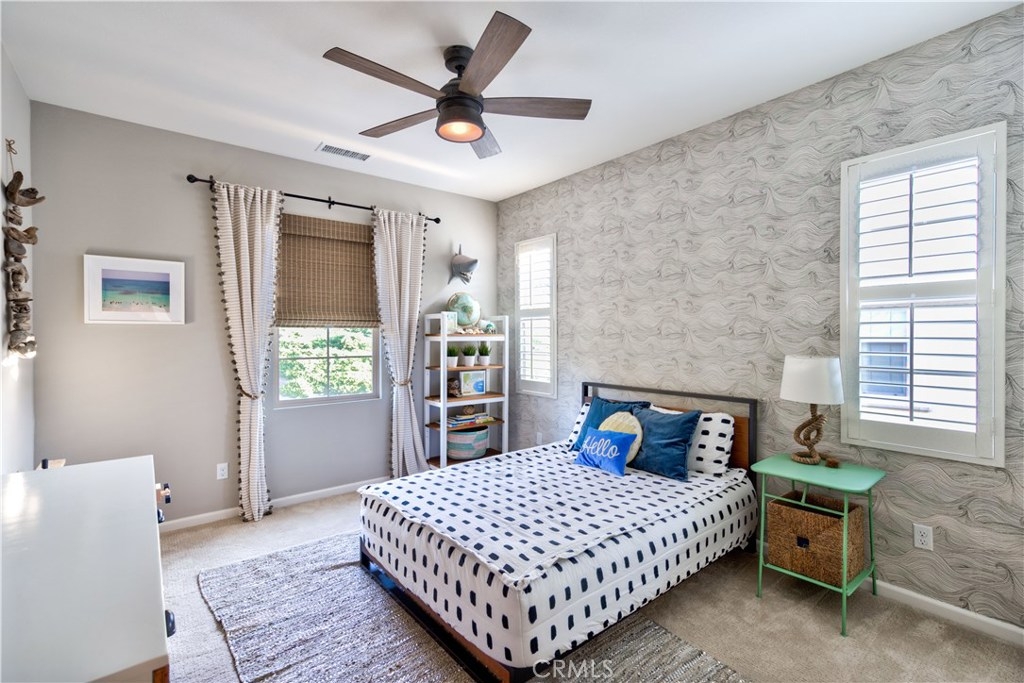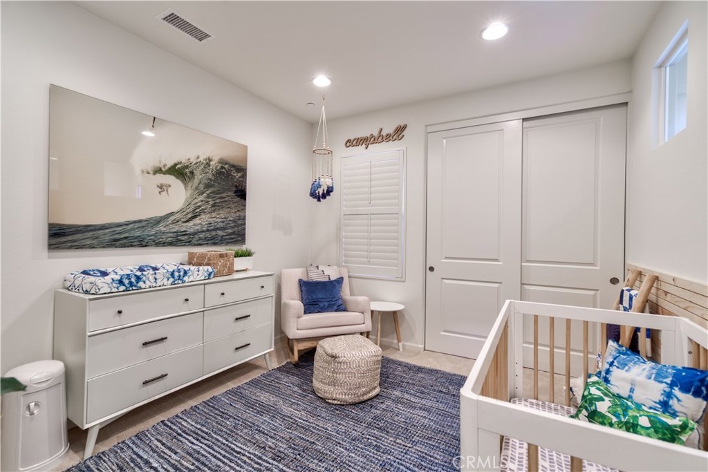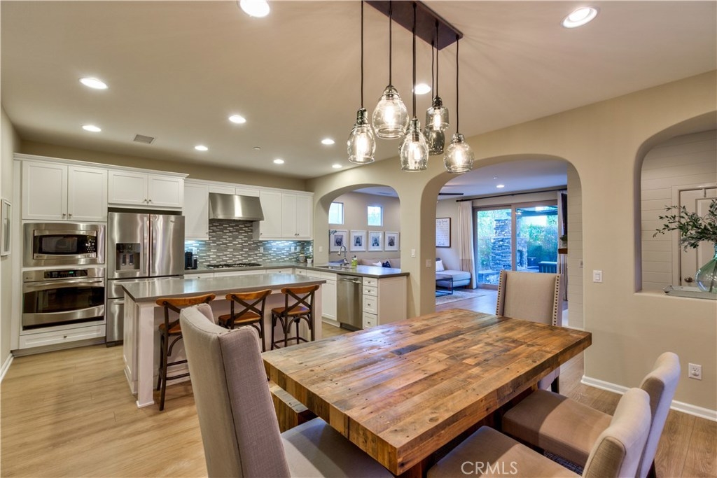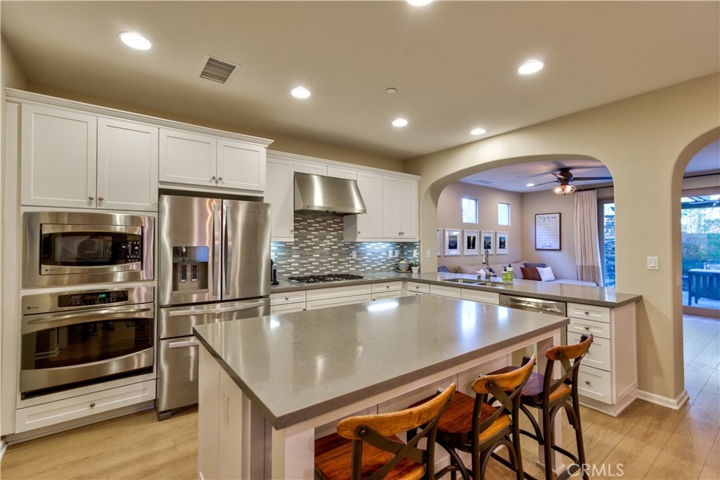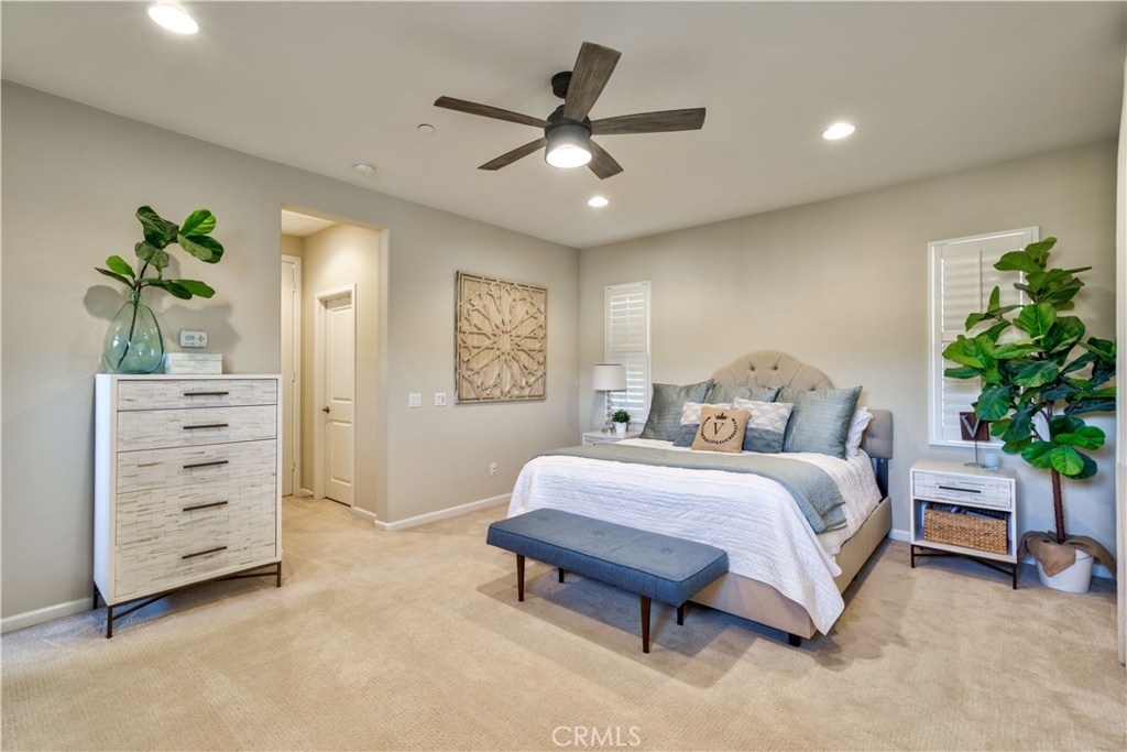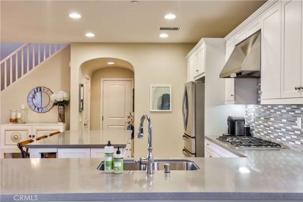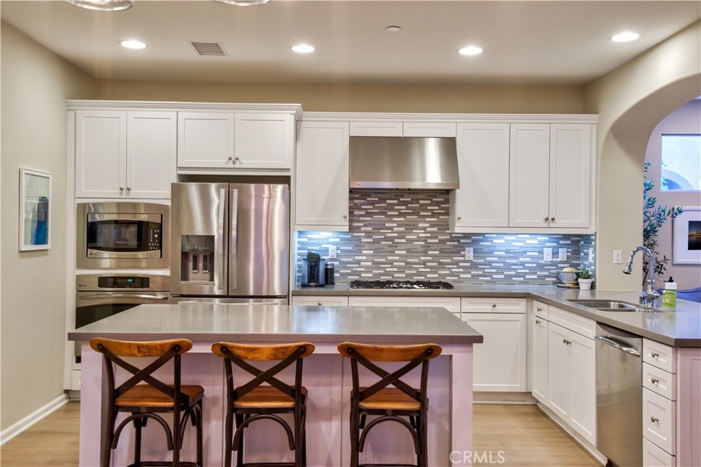 Welcome to this highly upgraded 4 bedroom, 3 bathroom home located in the gated community of Campanilla. It sits on a single loaded, corner lot that is very private. Custom pavers and olive trees greet you as you walk up to the front door. Open concept living at its best as you enter this gorgeous home! The gourmet kitchen is an entertainer’s delight with quartz countertops, stainless steel appliances and a designer back splash. In the center, a huge kitchen island with additional seating for your guests. There is a generous downstairs living space with 2 sets of oversized sliding doors from the kitchen and living room that lead out to the yard. Upstairs, the master suite offers a large walk-in closet, mountain views and a builder upgraded 5 piece bathroom. The loft was converted into a beautiful bedroom with custom windows, a large sliding barn door, wall accents and recessed lights. Upstairs laundry and mountain views from the two additional upstairs bedrooms. The outdoor living space boasts a custom stone fireplace, patio cover, ceiling fan and outdoor TV. The built in BBQ with fridge and seating for 8 will keep you entertained all year. Southern California living at its best! Low HOA and NO Mello Roos!!