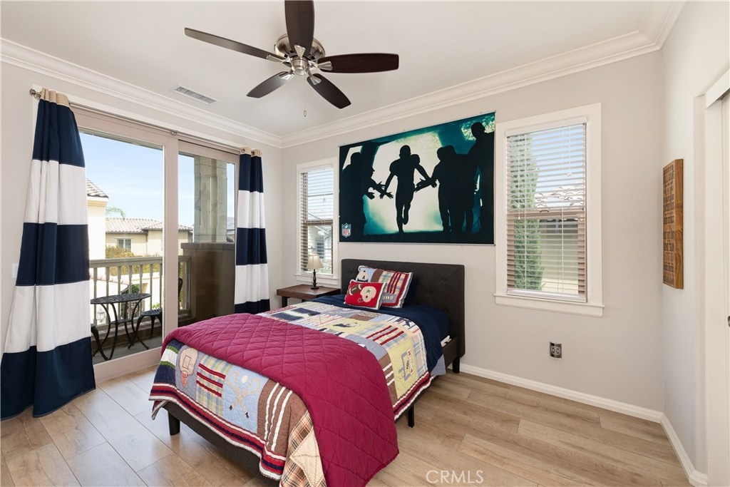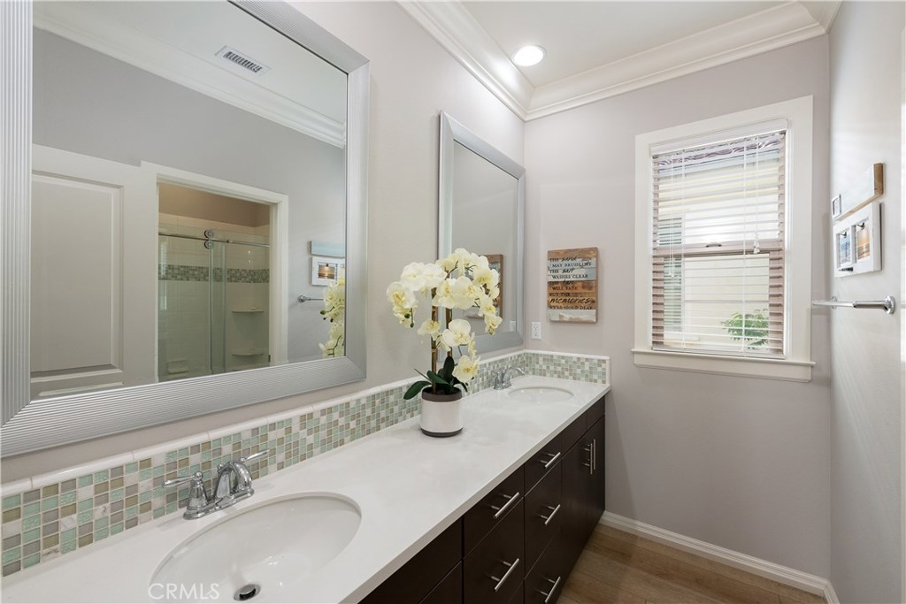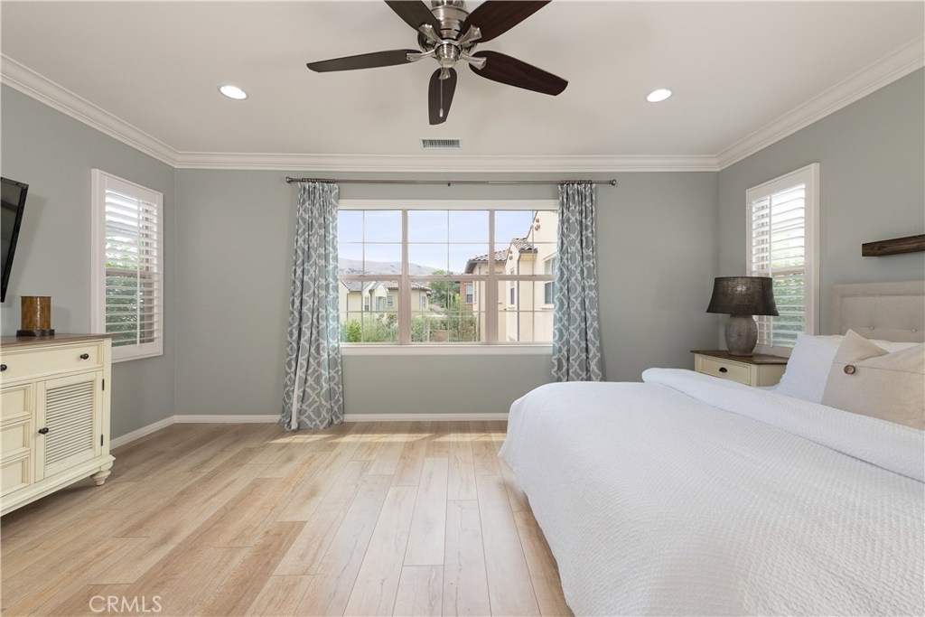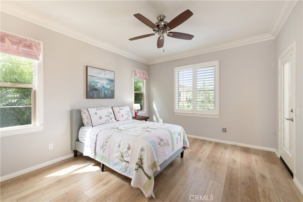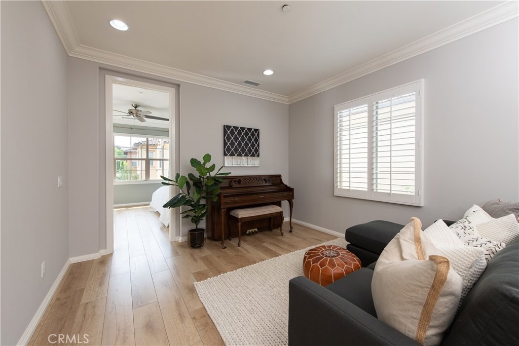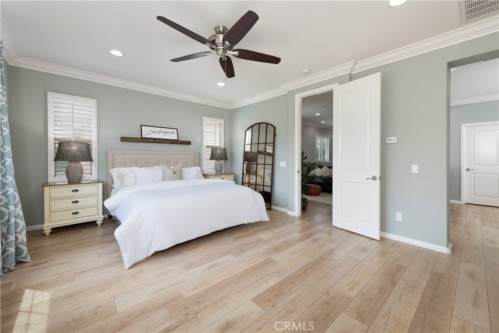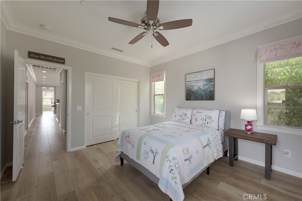 NO MELLO ROOS! Are you looking for an amazing home AND an amazing community? Then, this is the one. This turnkey property offers high-end amenities & designer flair. A secure gated entry leads to the private wrap around yard featuring custom hardscaping, lush landscaping, trellis, fire pit and boasts over $100,000 in upgrades in the backyard alone. The open concept plan boasts almost 2500 Sq. Ft.,4 Beds, 3 Baths & large loft area. The gourmet kitchen offers chic upgraded custom cabinetry, a large center work island, granite countertops and back splash, stainless steel GE Profile appliances & walk-in pantry. The kitchen & living areas are an entertainers dream with gas fireplace, custom built-in shelving & two sets of sliding glass doors that offer an amazing cross breeze & flow easily into the backyard; maximizing the indoor/outdoor living afforded by the Southern California lifestyle. A downstairs bedroom, which is wheelchair accessible offers a large closet with sliding barn door and pocket door. The master is spacious & airy with plantation shutters, dual walk-in closets, en Suite master bath with double vanities, shower & tub. The two secondary upstairs bedrooms, a full bath with dual vanities, spacious loft and large laundry room complete the upstairs. Upgrades include plantation shutters throughout, 6" baseboard, custom crown moulding, wide plank flooring throughout both levels, custom built-in garage cabinetry & overhead storage. NO MELLO ROOS. Low HOA & Taxes.