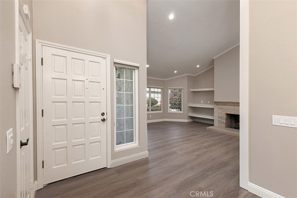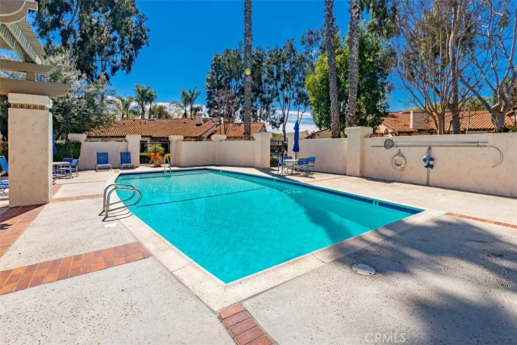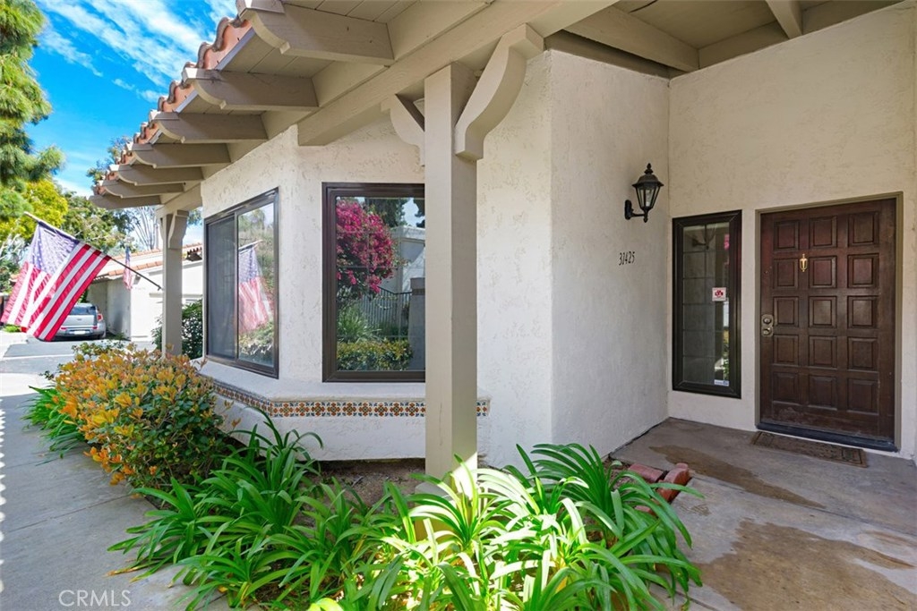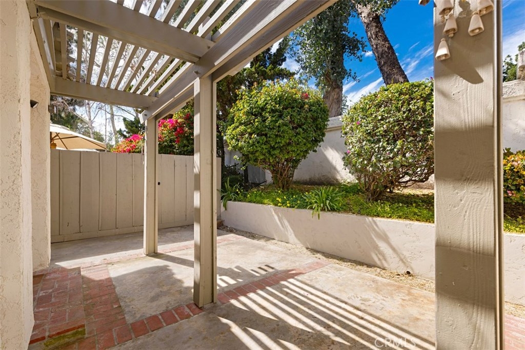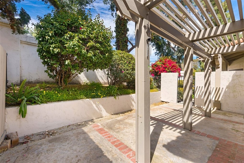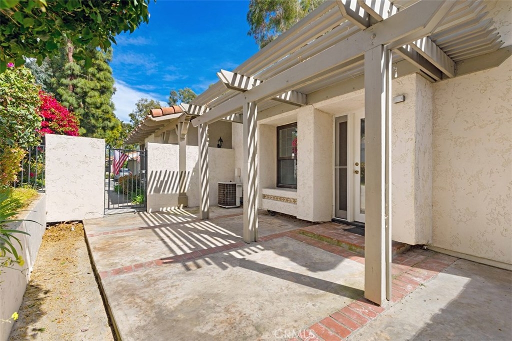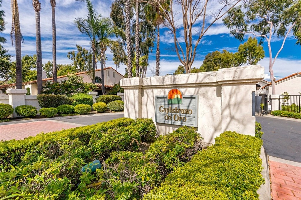 Welcome to this contemporary, move-in ready condo in the gated serene community of Capistrano de Oro in San Juan Capistrano. This single-story home features 2 bedrooms, 2 bathrooms and an attached 2-car garage with ample storage space. As you walk in you are greeted with soaring ceilings, crown molding and newer luxury vinyl plank flooring throughout. Step into your living room with built-in shelves, a cozy stone surround fireplace and large windows offering an abundance of natural light. The spacious kitchen features white cabinetry with black metal handles offering plenty of storage and is adjacent to the separate dining room with a skylight. As you make your way down the hall, you will find a spacious secondary bedroom and full bathroom. The master suite features vaulted ceilings, a full bathroom and direct access to your large patio. Enjoy entertaining family and friends underneath the charming pergola in your hardscape patio featuring a retaining wall with landscaping. Other notable features include contemporary black metal light fixtures, white cabinetry with black metal handles in both bathrooms and a low maintenance backyard. Just minutes away from historic downtown, schools, shopping, restaurants and entertainment. This home is a must see!