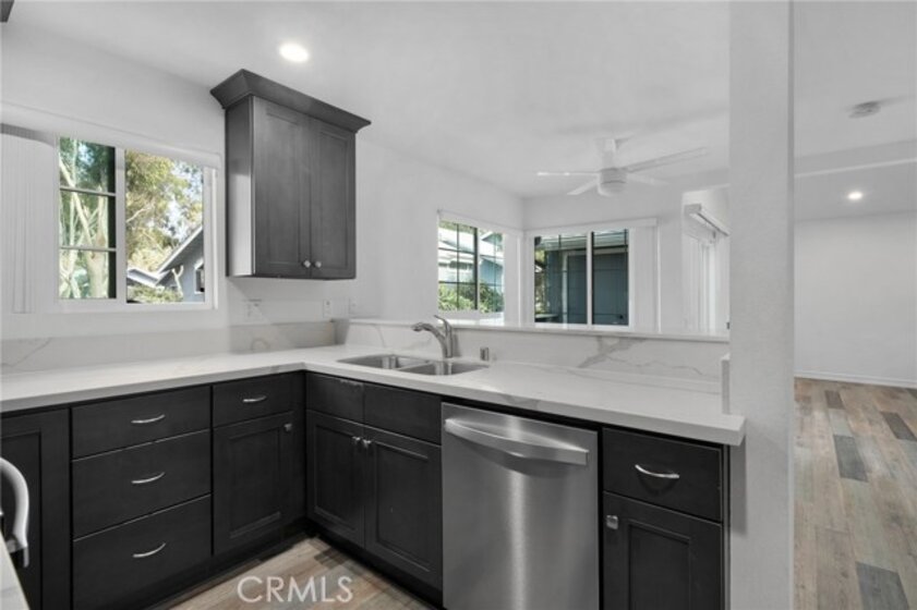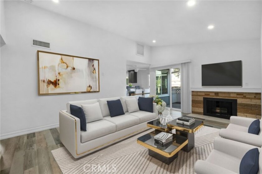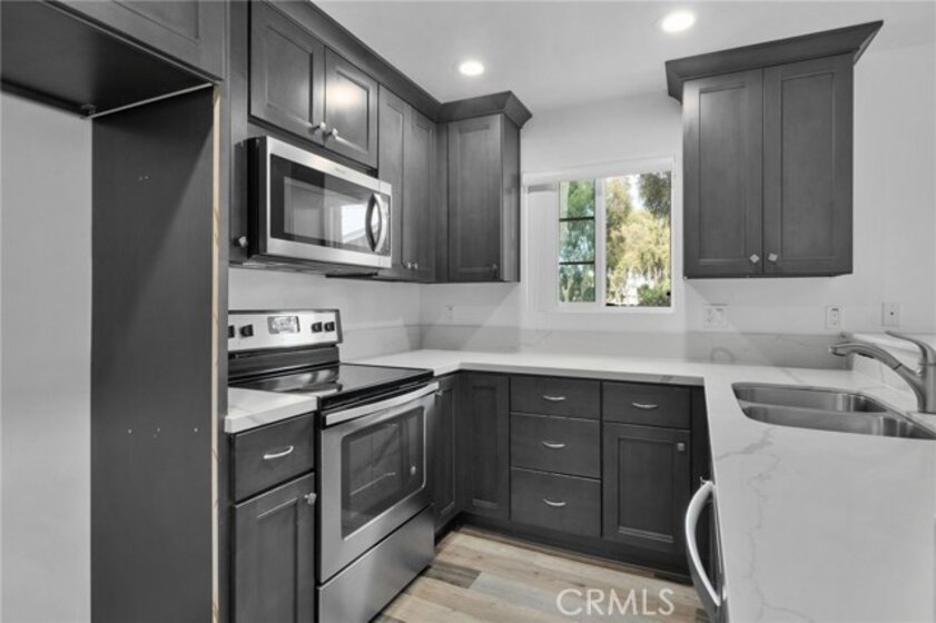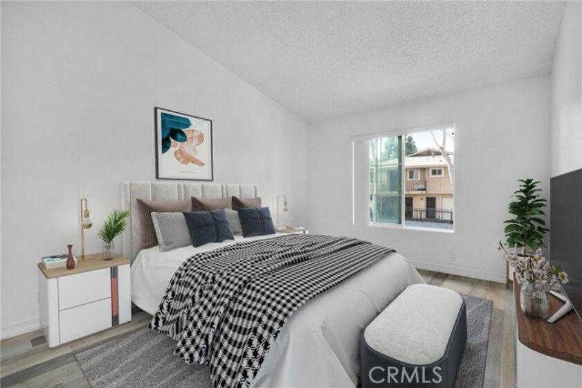 Stunning 2 bedroom, 2 bath top-floor unit, complete with central AC! The open layout offers vaulted ceilings, recessed lighting, and fresh updates throughout, including beautiful flooring and modern kitchen cabinets topped with quartz countertops. The kitchen is also equipped with stainless steel appliances like a stove, microwave, and dishwasher. The spacious master bedroom features dual closets, while the updated master bath boasts a dual-sink vanity with quartz counters and glass shower doors. The guest bath is equally stylish, with a new vanity, quartz counters, and updated mirror and lighting. Enjoy outdoor relaxation or dining on the patio. This unit also includes a 1-car garage and access to a community swimming pool, playground, and walking trails. Conveniently located near downtown restaurants, Los Rios Park, and Mission San Juan.