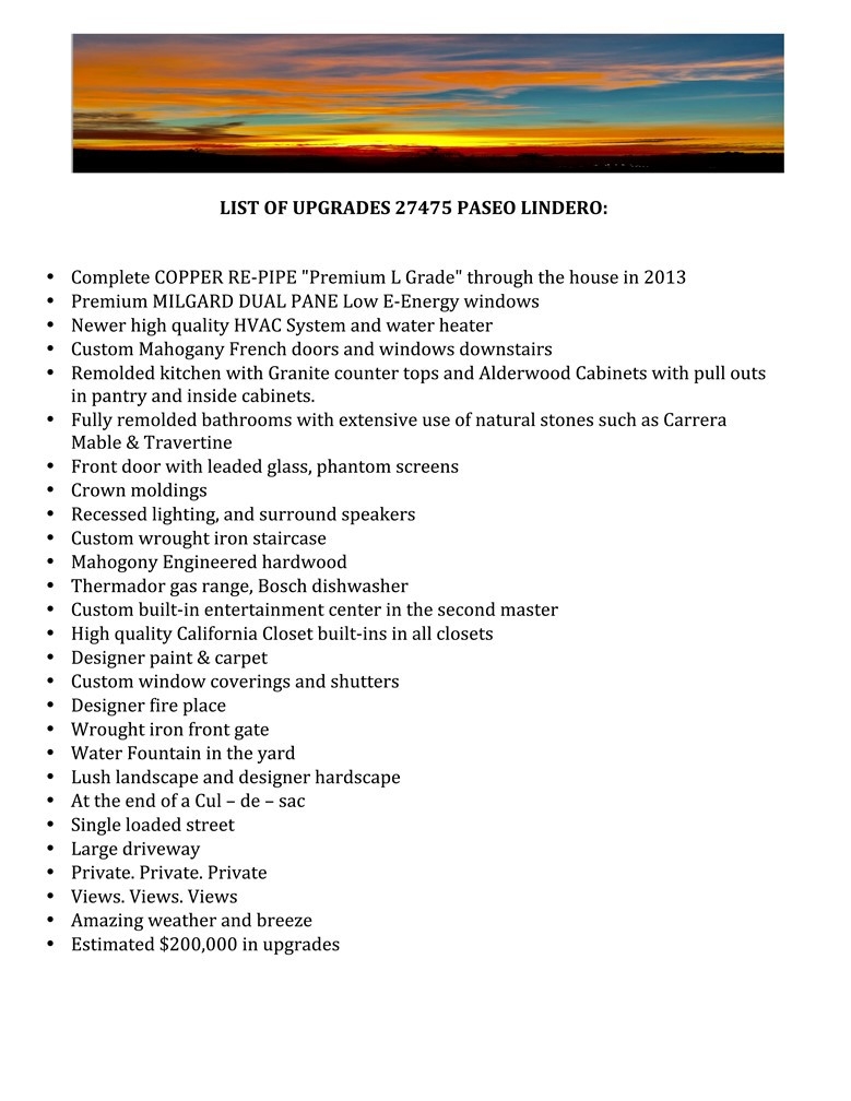 Magnificent sunset views combined with ultimate privacy & enchanting breeze makes this stunning house one in a million! Fully remodeled energy-efficient home w/high-quality custom upgrades & finishes from top to bottom with an open & bright floor plan. A gorgeous kitchen w/Granite counter tops & high-end appliances opens to the family room, dining room & back yard, creating an ultimate indoor-outdoor living space to entertain & enjoy sweeping panoramic sunsets, canyon, city light views. Excellent PRIVATE location, being situated at the very end of the CUL-DE-SAC on a single loaded street next to a greenbelt. The floor plan includes TOW LARGE MASTER BEDROOMS w/remodeled en-suite bathrooms up & two bedrooms downstairs. Complete COPPER RE-PIPE "Premium L Grade" in 2013, NEWER HVAC system, Premium MILGARD DUAL PANE Low E-Energy windows with custom Mahogany French doors, front door w/ leaded glass, phantom screens, crown moldings, recessed lighting, custom wrought iron staircase, surround speakers, engineered hardwood, natural stones such as Carrera Mable & Travertine, Alderwood kitchen, Thermador gas range and dishwasher, pull out pantry, custom built-in entertainment center, designer paint & carpet, California Closet built-ins, custom window covering & much more! ALMOST $200,000 IN UPGRADES! Conveniently located near the community pool, spa & Park. Close to golf, train station, old town shopping and world-class dining! Just a few min to Dana Point Harbor*A PEACEFUL SANCTUARY*