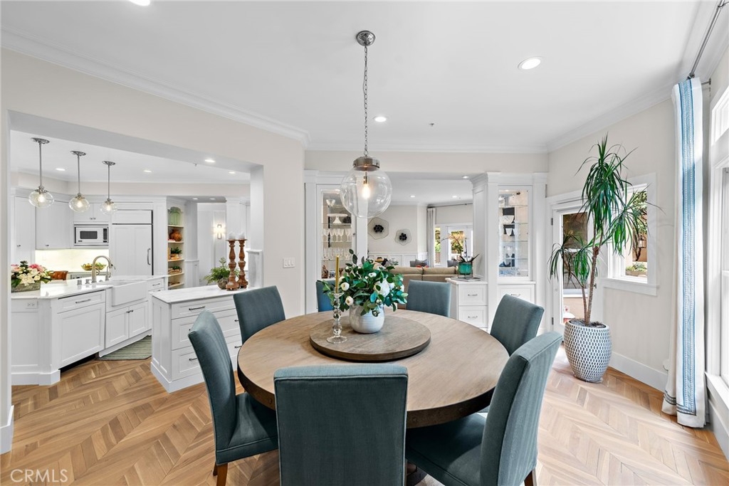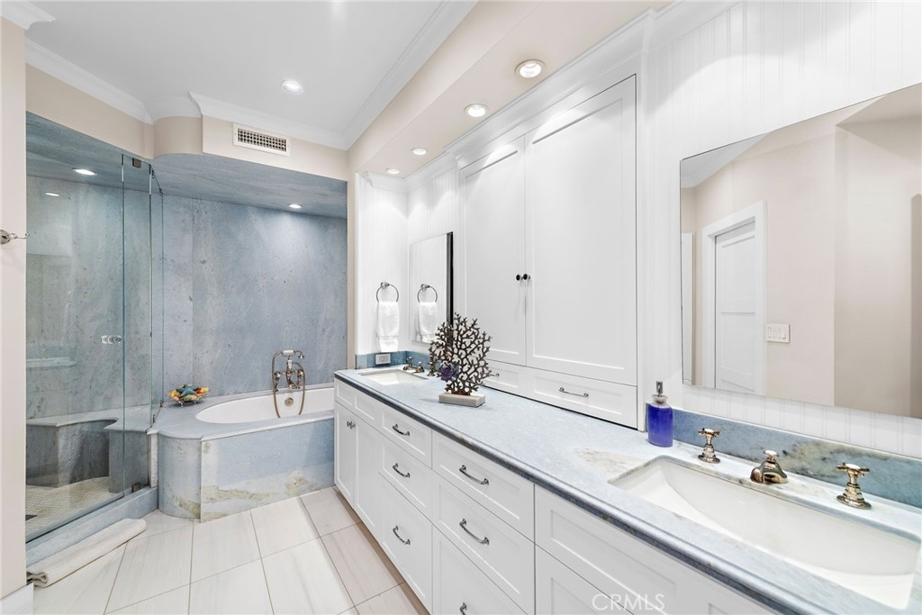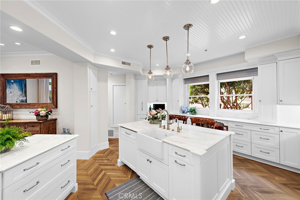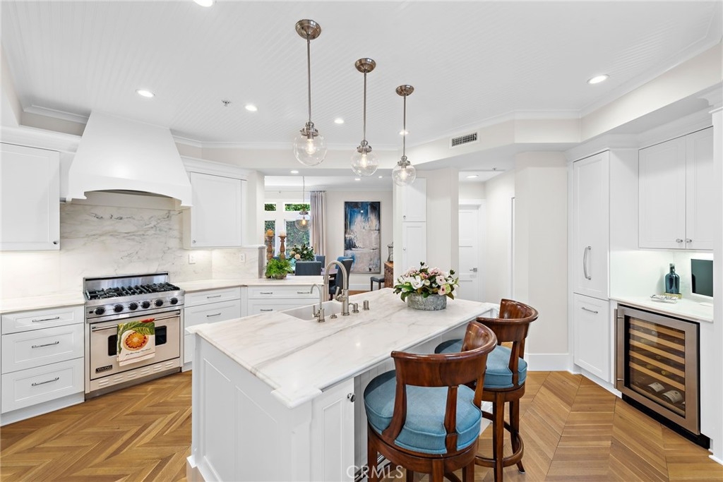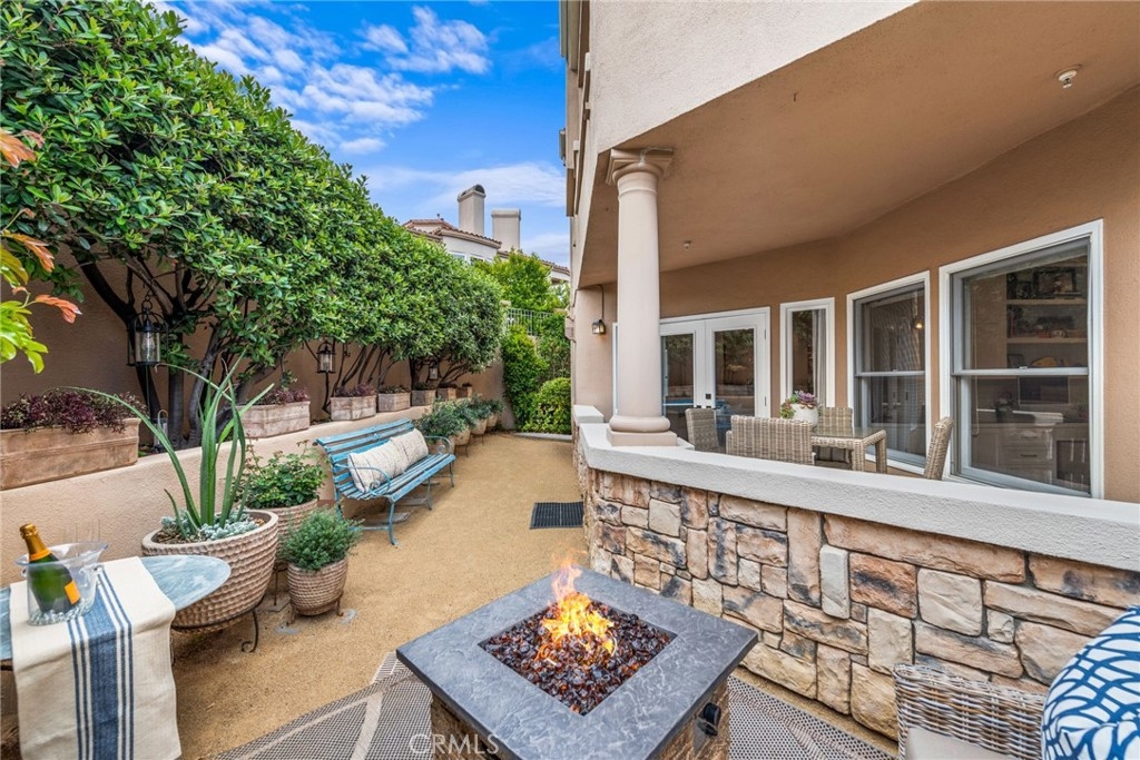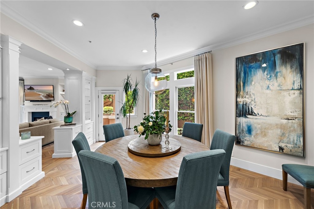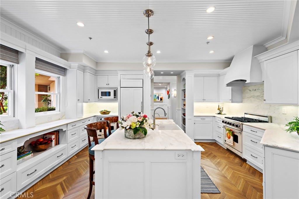THE MOST UPGRADED VILLA to hit the market in Marbella Golf Villas, featuring the most desirable floorplan (2BR + Office/3BR) and one of the few with a direct-access 2-car garage + dedicated driveway. This ground-level residence has been fully reimagined with top-tier finishes and refined design throughout. Highlights include Richard Marshall chevron-pattern hardwood flooring, custom wood casings and sills on all windows and doors, detailed millwork, and custom ceiling treatments that add architectural interest. The kitchen was redesigned to enhance storage & function—featuring an oversized island with seating, Calacatta Gold marble countertops and backsplash, custom cabinetry with pantry, double Viking ovens with gas range, Sub-Zero refrigerator, Viking microwave, wine refrigerator, beadboard ceiling detail, and designer pendant lighting. The adjacent formal dining room seats 8-10 comfortably and flows into a spacious living room, where dated columns were removed and replaced with tasteful display cabinetry. The fireplace was redesigned with a direct-vent system and flanked by built-in cabinetry and shelving for AV equipment and added storage. A custom wood mantel and tailored millwork add warmth. French doors open to a tiled covered patio with gate access to HOA open space for added outdoor versatility. In addition to two generous bedrooms, the home includes a fully built-out office tucked behind a barn door—featuring his-and-her desks, upper and lower cabinetry, and a window seat with added storage, making it a true work-from-home retreat. The primary suite is both elegant and serene, offering golf course views, a cozy fireplace with custom cabinetry, beadboard ceiling detail, classic wall paneling, and a French door that opens to the outdoors. The reimagined primary bath features dual vanities, a soaking tub, and a walk-in shower with mosaic stone flooring—all are adorned with rare full-slab Cristal Blue granite—and it includes a custom walk-in closet with built-in organizers. The secondary suite includes a coved ceiling, ensuite bathroom, and custom built-in closet system. Additional highlights include epoxy line plumbing pipes, inside laundry with upper cabinetry, a tankless water heater, newer HVAC system, whole-home water softener, garage with built-in cabinetry, work bench + utility sink, Hunter Douglas window treatments, Lutron lighting system, designer ceiling fans, tall ceilings, and lovely natural light throughout. NO OTHER VILLA COMPARES!