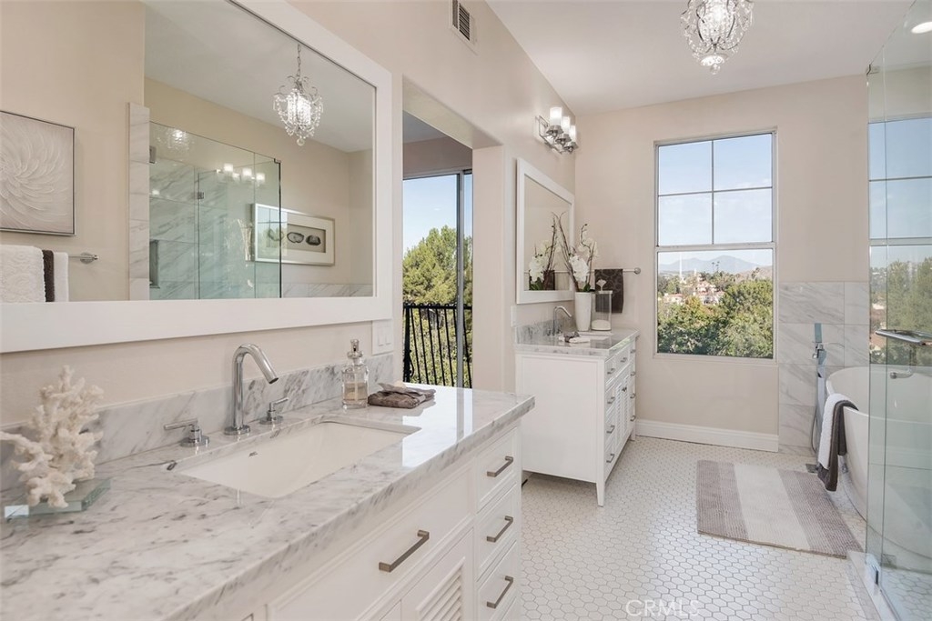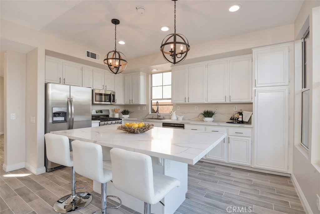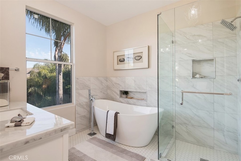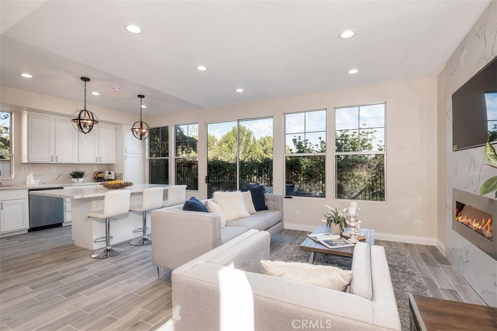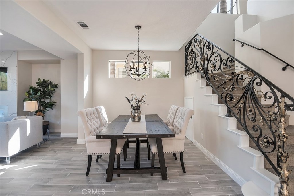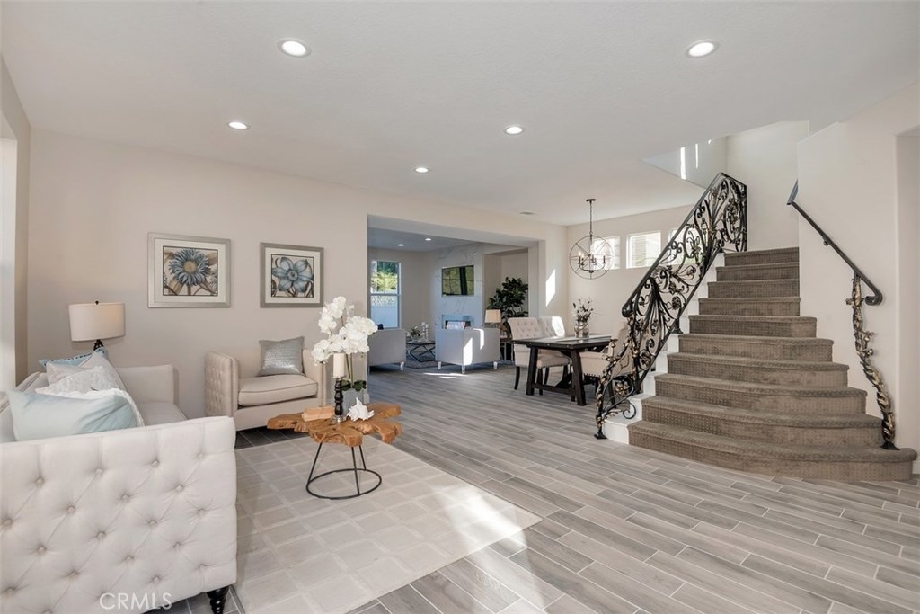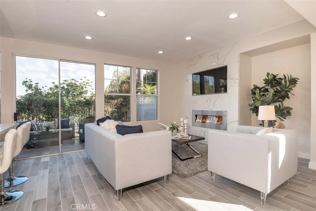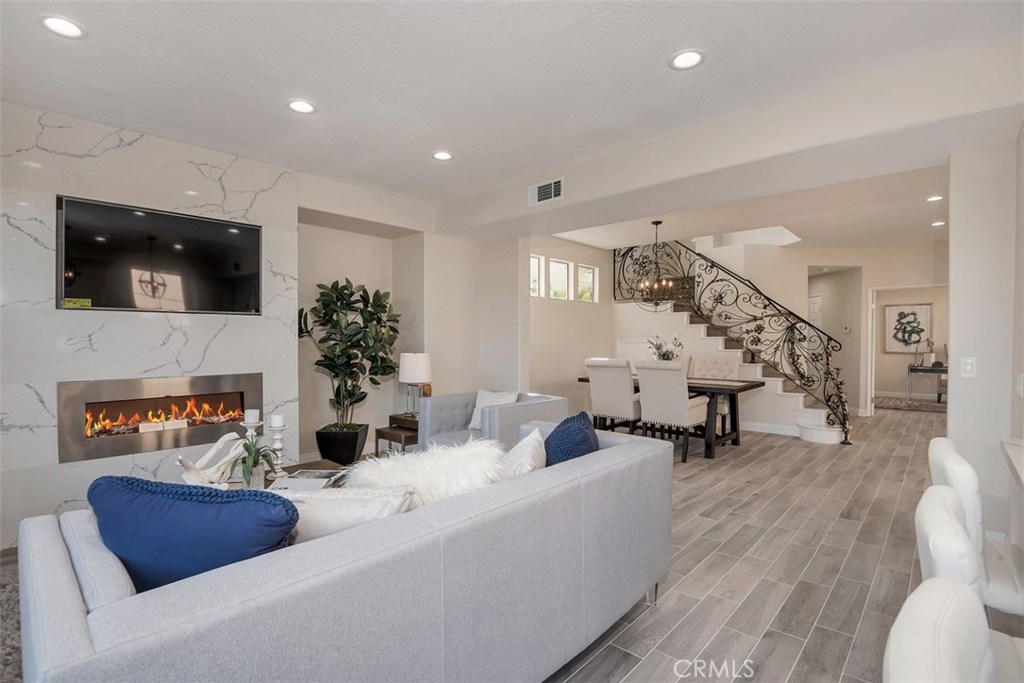 Live in luxury with this stunning, 5-bedroom, 3-bathroom home, located in the prestigious gated community of San Juan Hills. This beautiful 2,500 sq ft property offers a delectable elegance that is truly one-of-a-kind. Completely remodeled with top-quality appliances and upgrades, the open floor plan is an entertainer’s dream. Desirable features include convenient downstairs office or optional fifth bedroom, tasteful ceramic wood flooring, neutral designer paint, new carpeting, LED lighting, and custom iron stairwell. The gourmet Chef’s Kitchen offers quartz countertops, a spacious island area, brand-new stainless-steel appliances with a 5-burner stove, refrigerator, and detailed finishes. The inviting living room is home to an electric fireplace, nestled below a built-in 55” TV on a distinct floor-to-ceiling quartz wall. Upstairs you will find a spacious master bedroom with a generous master retreat. Upon entering the master bathroom, you will find Carrara marble-top vanities with a chic crystal chandelier, waterfall-spout faucet, contemporary master bathtub, Italian tile walls and a walk-in closet. High quality, artificial turf, wrap-around patio and peaceful tree-lined views create an enjoyable outdoor atmosphere as well. With the perfect combination of style, class and comfort, this home is truly a must-see.