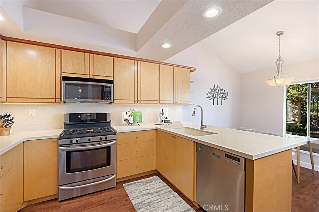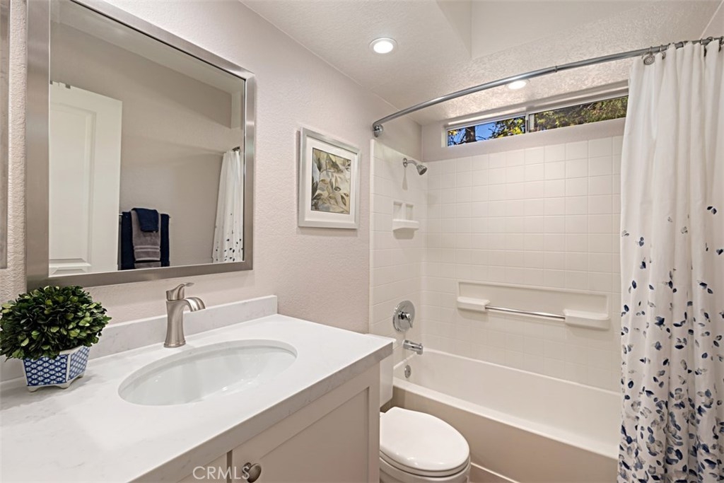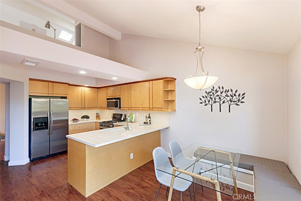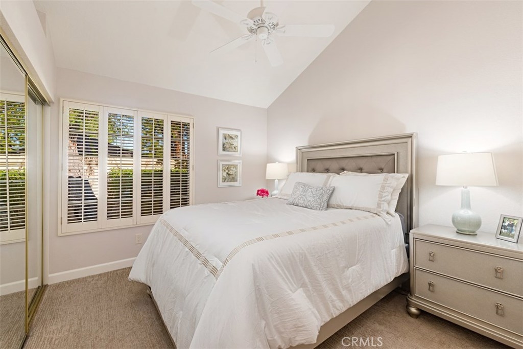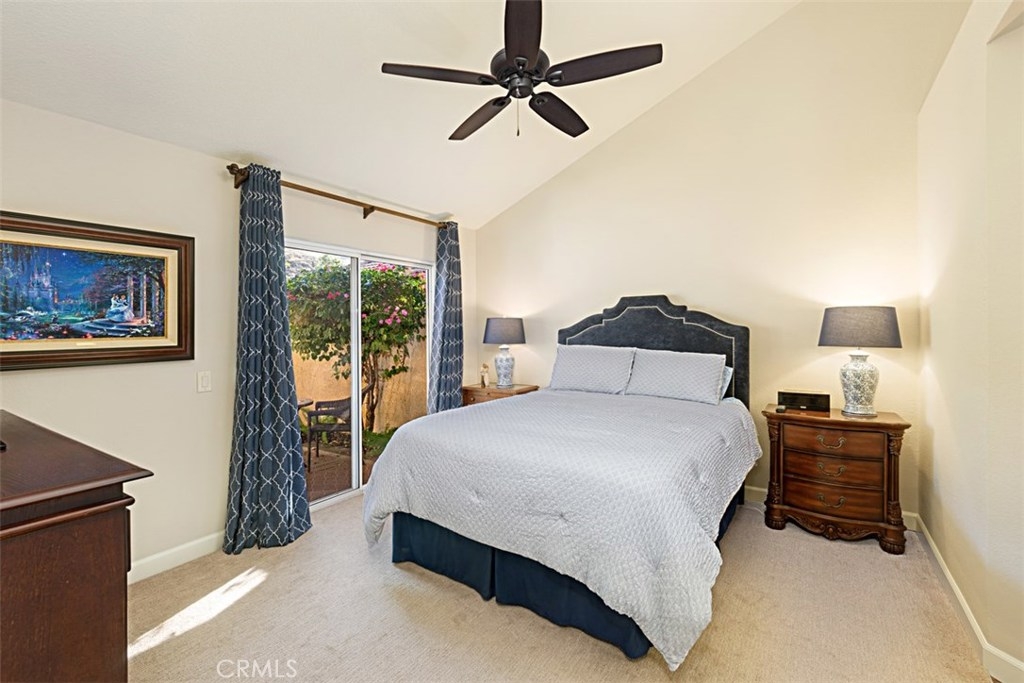 All bedrooms are on the main level with a loft in the upper level. There is a very high end modern sectional sofa in loft that will remain with the property. Step into the entry of this attached townhouse and the pathway is lined with beautiful flowering plants. Go thru the Blue door to a beautiful remodeled open floor plan that displays patio doors with a private beautiful backyard and patio area with views, yes views! New rich dark flooring thru out the entire lower living area. Bedrooms are carpeted. The Livingroom has new custom built-in cabinets next to fireplace with wonderful newly tiled fireplace and new screen. Only the living room Sharp 65" large flat screen TV is included. The front bedroom could be den or bedroom. The two baths are upgraded light and beautiful. Kitchen has rich maple custom lower cabinets with coordinating upper cabinets and deep mahogany trim. New kitchen Blanco Granite sink, new motorized window coverings over kitchen patio door. Wonderful custom built-in seating area with built-in storage and room for table and chairs for kitchen dining , also magnificent view of backyard. The master bedroom is spacious with walk-in closet. Full bath in master that has been upgraded. Second bath has quartz counter tops. We also have a small formal dining room that seats six. Newly painted through out with new deep base board. Simply a stunning find!
