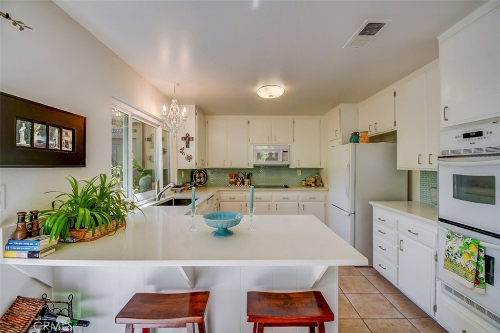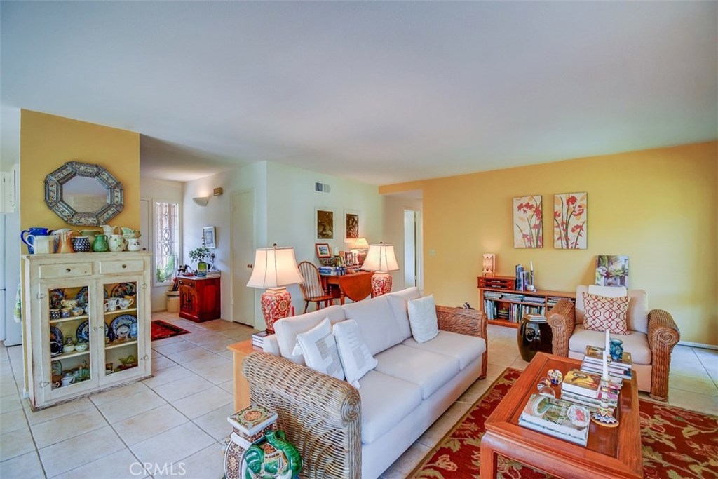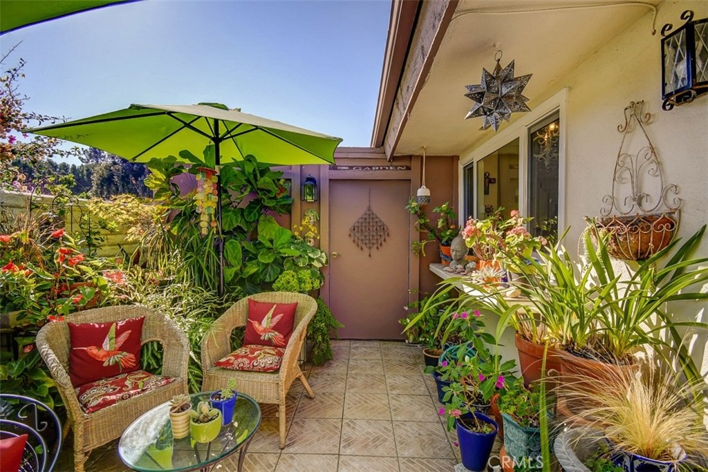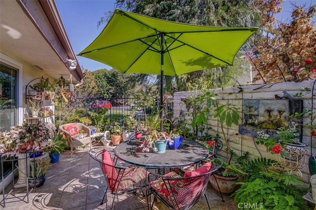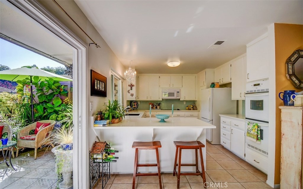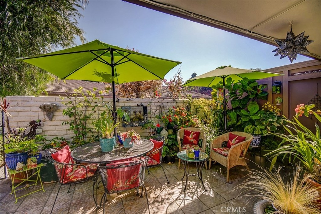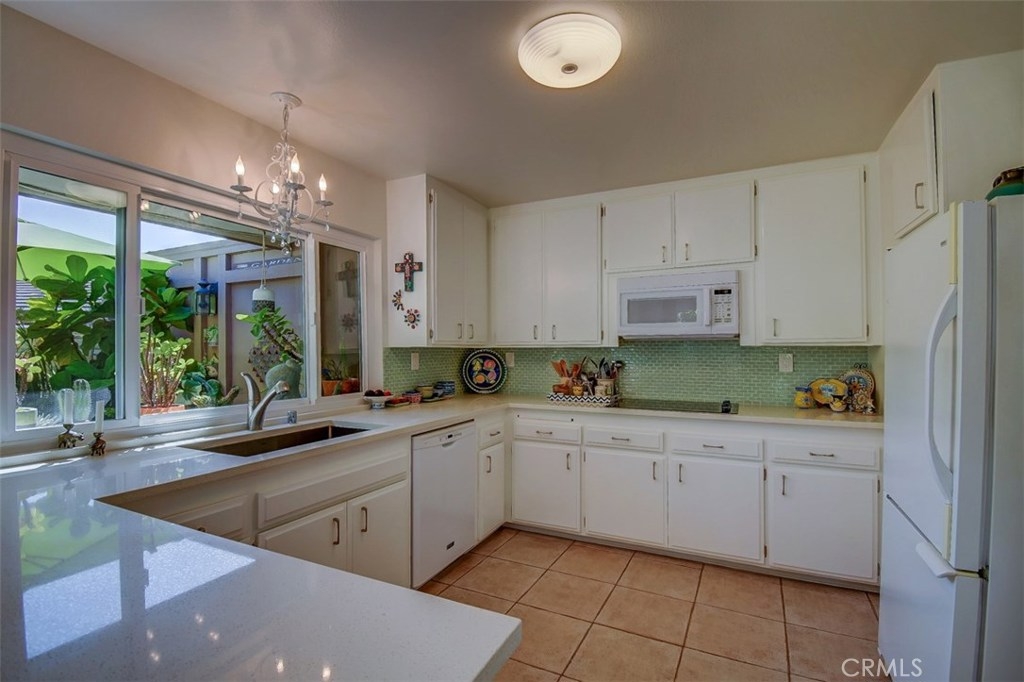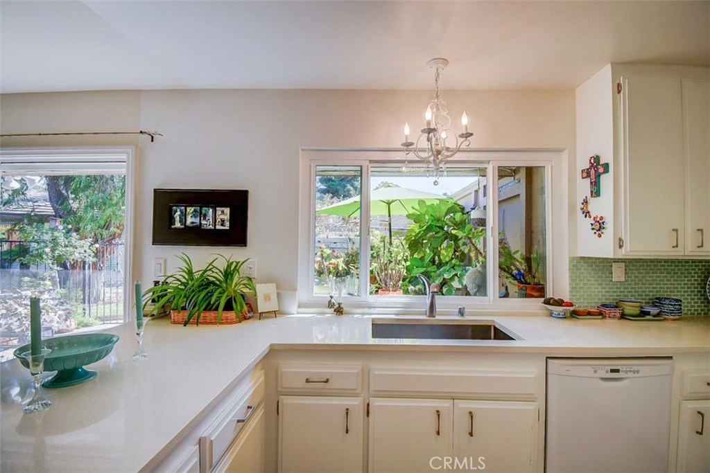 One of the best locations within the community. Coveted end unit location with lovely views of the greenbelt and peek a boo view of the Golf Course above, this home will please the fussiest buyer. Tastefully updated kitchen features quartz counter tops, under mounted stainless steel farm sink, fully tiled back-splash with glass tiles, bar seating. Fantastic open concept floor plan, with kitchen, dining and living room all open to each other and sliding glass doors out to the lush private patio on the side and a sliding glass door out to the front green belt area. New windows throughout. Both of the bathrooms have been remodeled and are gorgeous. The master bathroom features travertine tiled floors, counter top, and full walk in shower. The secondary bath features glass tile counter. The large master bedroom has a sliding glass door out to a side private patio. Inside washer dryer hook ups. Easy to access two car garage just steps from the front door. Community features swimming pool close by. Close to shopping, golf course, the beach. Wonderful 55+ community. One bedroom currently used as an office.