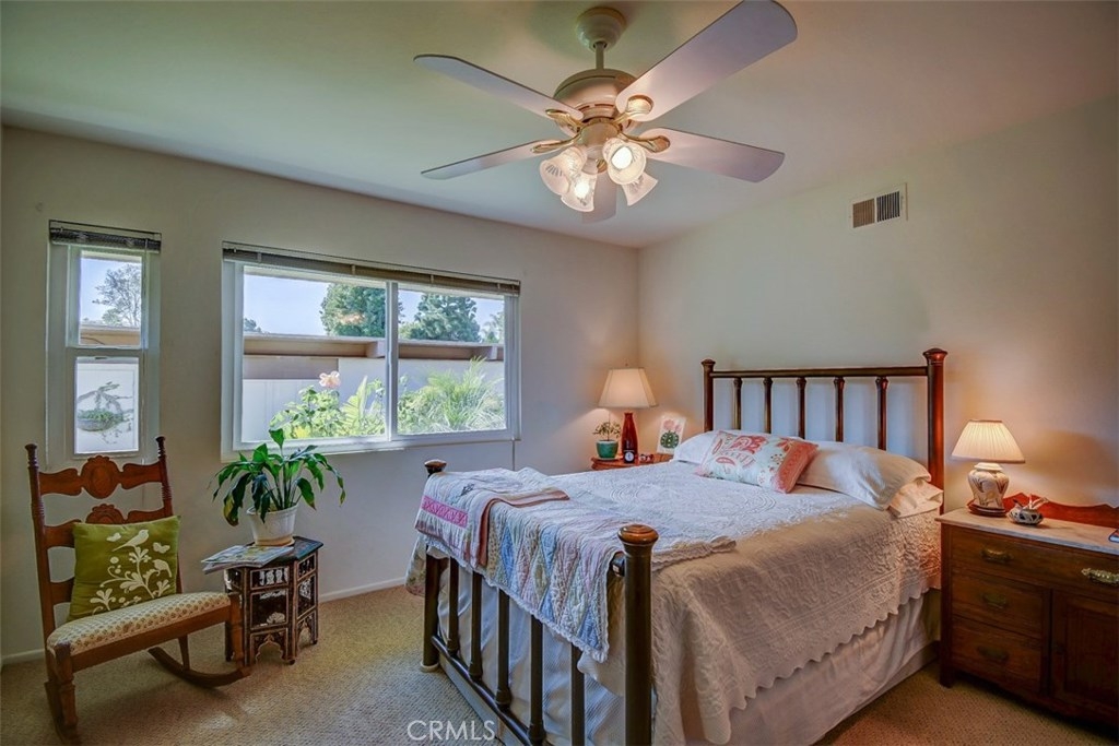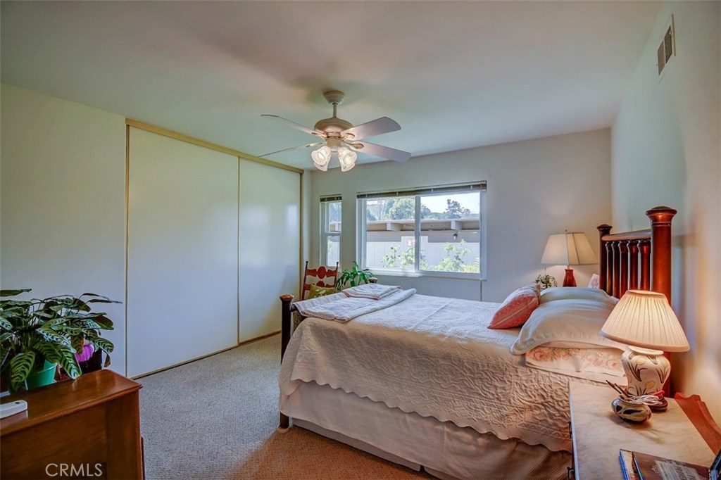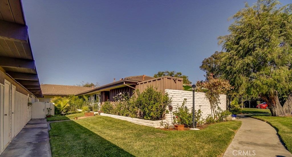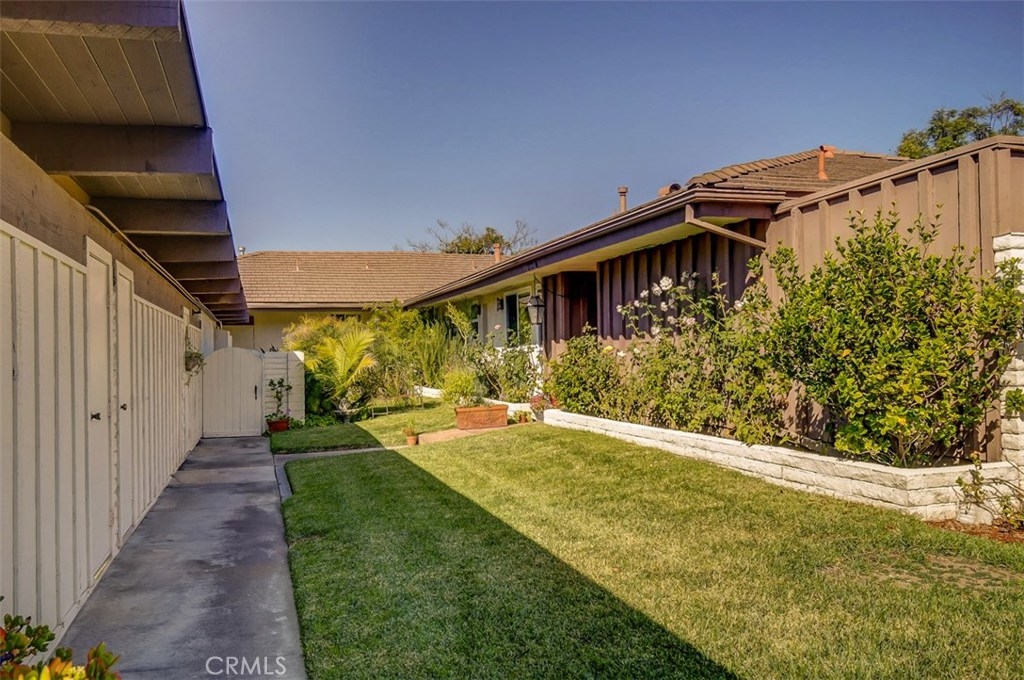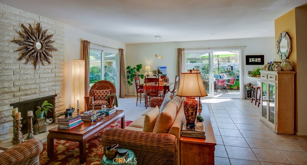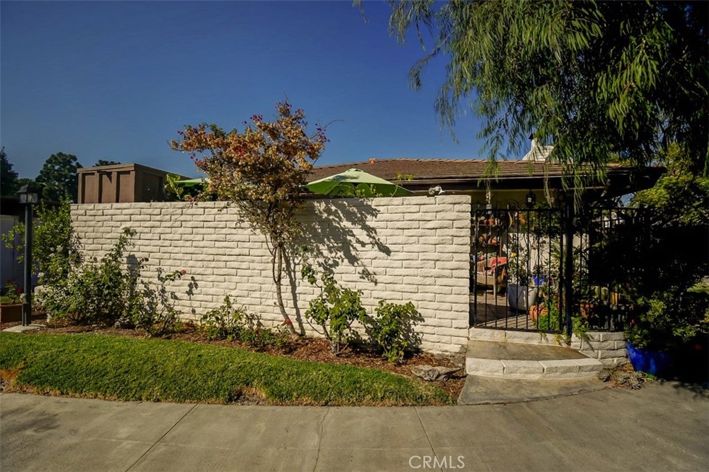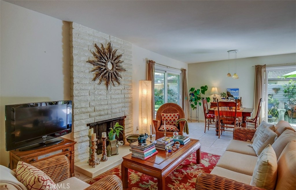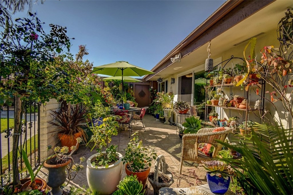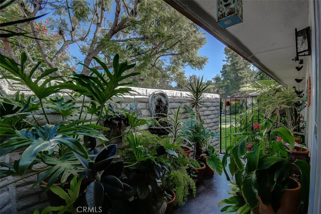 One of the best locations within the community. Coveted end unit location with lovely views of the greenbelt and peek a boo view of the Golf Course above, this home will please the fussiest buyer. Tastefully updated kitchen features quartz counter tops, under mounted stainless steel farm sink, fully tiled back-splash with glass tiles, bar seating. Fantastic open concept floor plan, with kitchen, dining and living room all open to each other and sliding glass doors out to the lush private patio on the side and a sliding glass door out to the front green belt area. New windows throughout. Both of the bathrooms have been remodeled and are gorgeous. The master bathroom features travertine tiled floors, counter top, and full walk in shower. The secondary bath features glass tile counter. The large master bedroom has a sliding glass door out to a side private patio. Inside washer dryer hook ups. Easy to access two car garage just steps from the front door. Community features swimming pool close by. Close to shopping, golf course, the beach. Wonderful 55+ community. One bedroom currently used as an office.