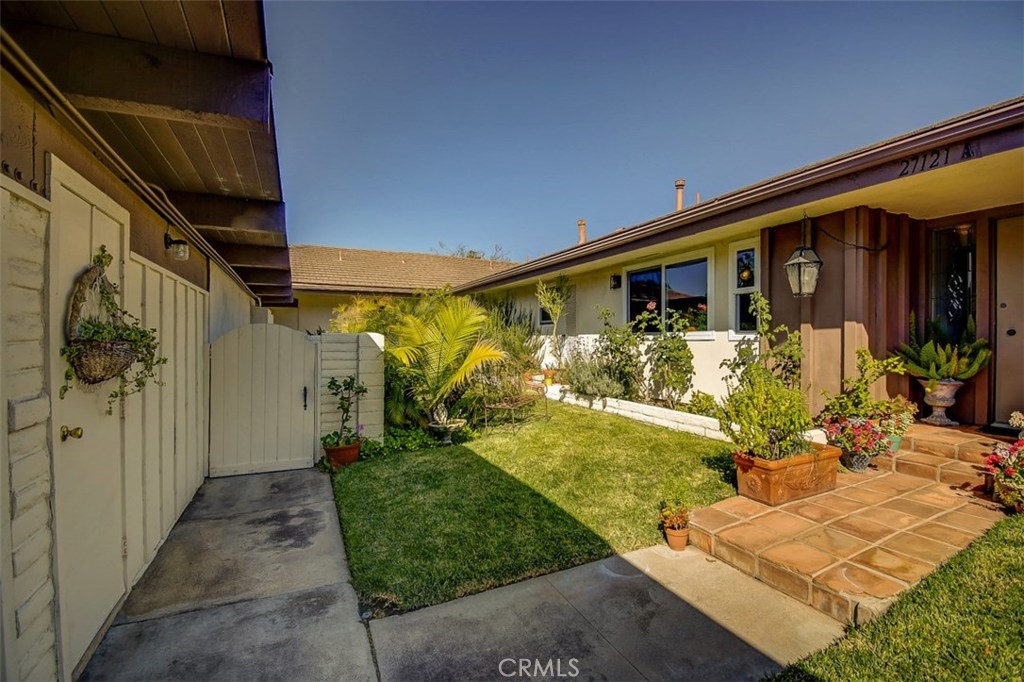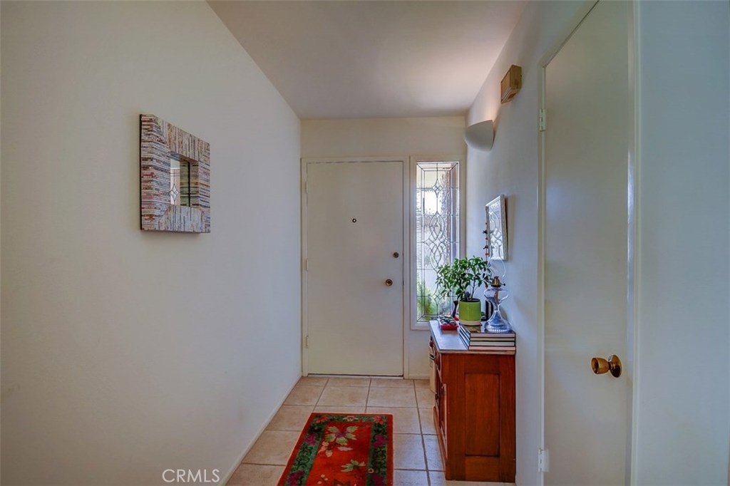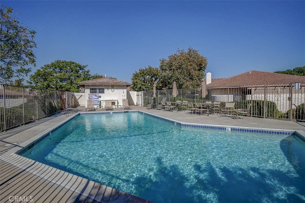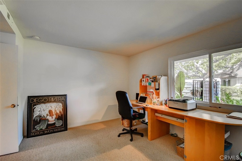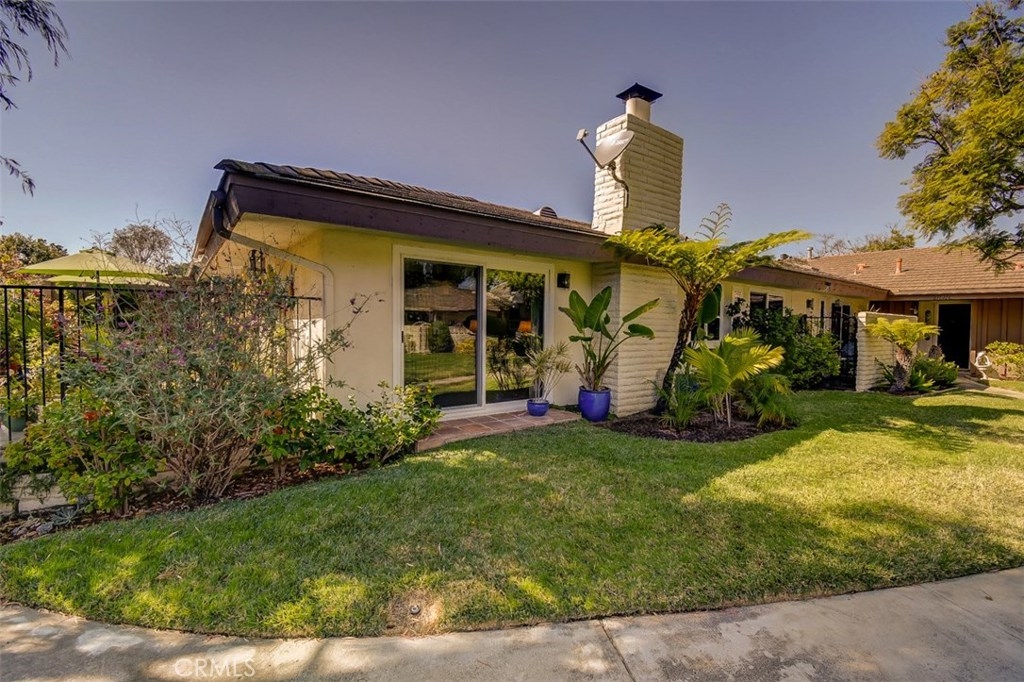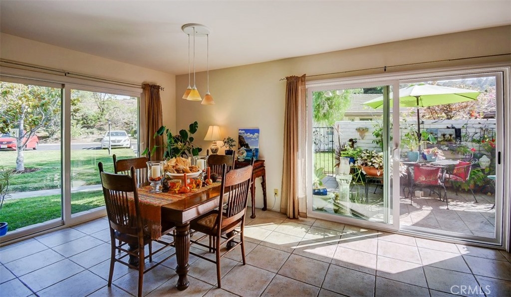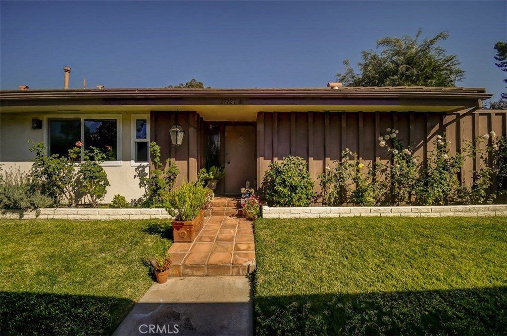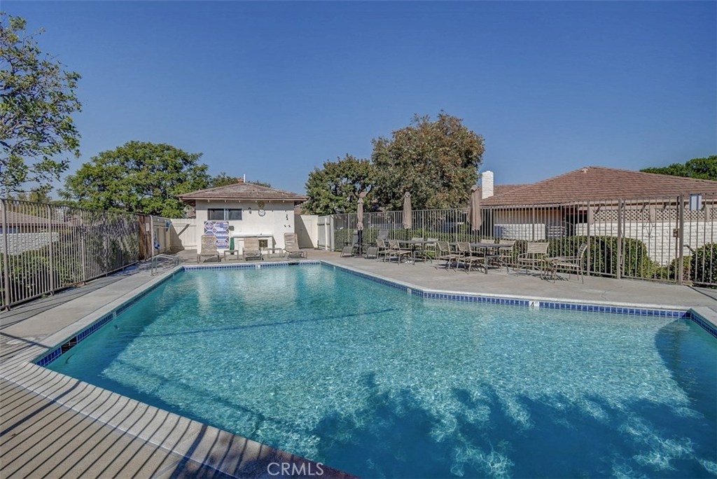 One of the best locations within the community. Coveted end unit location with lovely views of the greenbelt and peek a boo view of the Golf Course above, this home will please the fussiest buyer. Tastefully updated kitchen features quartz counter tops, under mounted stainless steel farm sink, fully tiled back-splash with glass tiles, bar seating. Fantastic open concept floor plan, with kitchen, dining and living room all open to each other and sliding glass doors out to the lush private patio on the side and a sliding glass door out to the front green belt area. New windows throughout. Both of the bathrooms have been remodeled and are gorgeous. The master bathroom features travertine tiled floors, counter top, and full walk in shower. The secondary bath features glass tile counter. The large master bedroom has a sliding glass door out to a side private patio. Inside washer dryer hook ups. Easy to access two car garage just steps from the front door. Community features swimming pool close by. Close to shopping, golf course, the beach. Wonderful 55+ community. One bedroom currently used as an office.