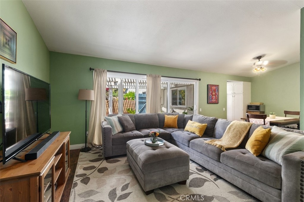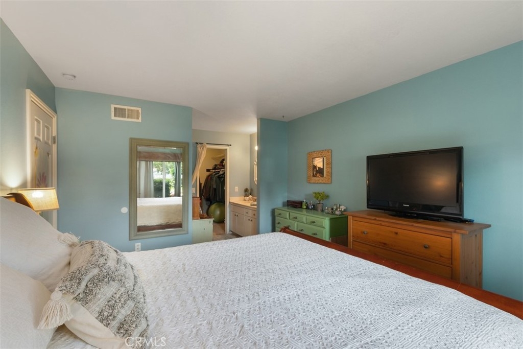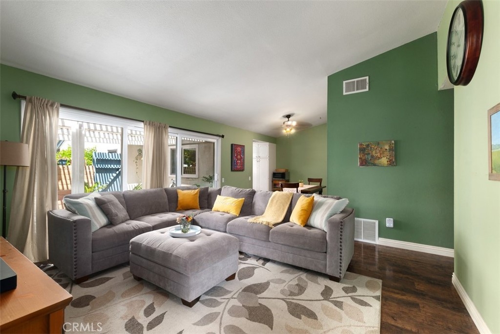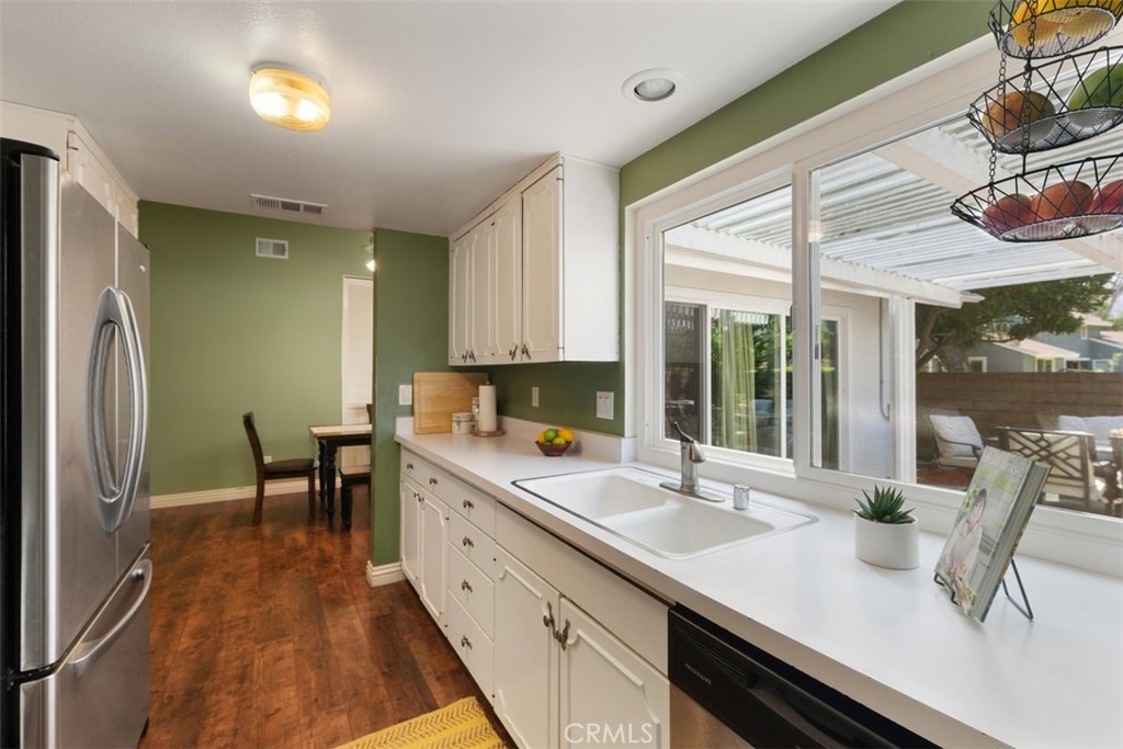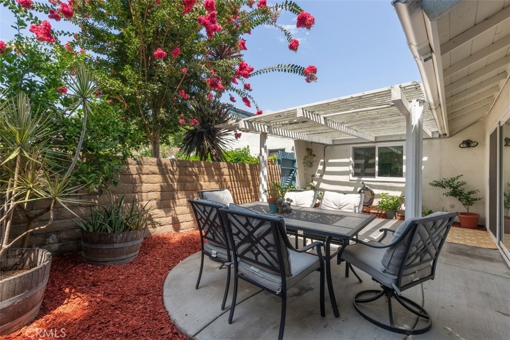 Exceptional opportunity for this 3 bedroom end unit single story townhome in the desirable community of Village San Juan! Feels like a private family home with a sliding door leading to an enclosed patio with Mandarin and Lime trees and a direct access 1 car garage. Features include vaulted ceilings, stainless steel appliances, gorgeous hardwood-like flooring, upgraded main bathroom with tile flooring PLUS an additional vanity area with sink in Master adjacent to a walk in closet. The dual pane vinyl windows throughout the home bring in lots of natural light. The home opens to a serene setting of greenbelt and mature trees. Enjoy walking to the many community amenities including Clubhouse, Pools, Playgrounds, BBQ area, Volleyball Court, 2 Lakes with ducks, fish & turtles. The neighborhood is ideally located close to bike and hiking trails, restaurants, shopping, schools and golf and ocean with easy access to the 5 freeway and 73 toll road.