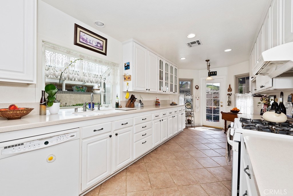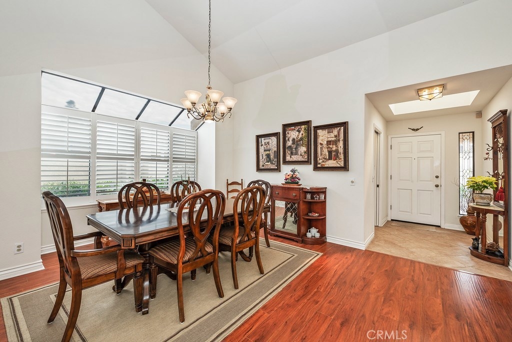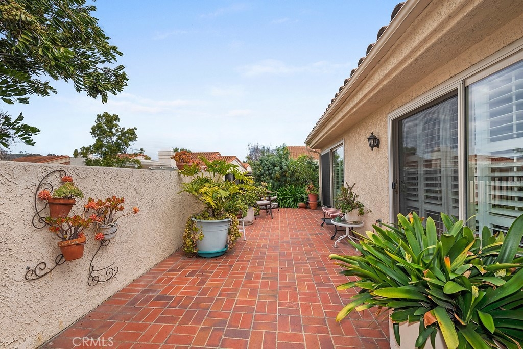 Rare find in Mesa Verde! Single level, located on a quiet cul-de-sac with views of gentle rolling hills and golf course. Beautiful curb appeal, with gated front courtyard flowing the entire length of the home, floored with brick and accented with flowering gardens, that add a special charm. Step inside and sunlight is immediately noted, from the skylight in the foyer, to multiple newer double paned windows accented with plantation shutters, to an inviting social space that houses a dining room, living room with a fireplace, and a wall of plantation doors and shutters that open to a charming patio that overlooks the greenbelt, walking paths and most notably the 12th fairway of the The San Juan Hills Golf Course. Neutral colored walls, wood and tile flooring, and soaring A frame ceilings all create a very clean, bright, and airy feel. The kitchen offers plenty of counter space, updated cabinets with pull out shelves and Lazy Susan features, garden window, and doorway to front courtyard for kitchen-side dining by the BBQ station. 2 sizable guest bedrooms, one with a wall of built-ins. The master also opens to this home’s special views. The master bath has dual sinks, sunken tub and step in shower. Don’t miss the 2 car garage with work bench and cabinet storage. This neighborhood offers two pools and spas, winding walking paths, open park-like greenbelt, and mature foliage allowing it to blend seamlessly with its natural environment.